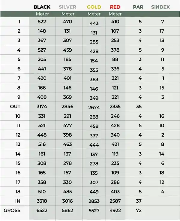 Montgomerie Maxx Royal Golf Course offers a challenging experience with slope ratings from the back tees of 143 (black), 136 (white), and 125 (yellow) for men and 142 (yellow) and 139 (red) for women. These ratings reflect the course's unique design and level of difficulty, ensuring a rewarding game for players of all skill levels.